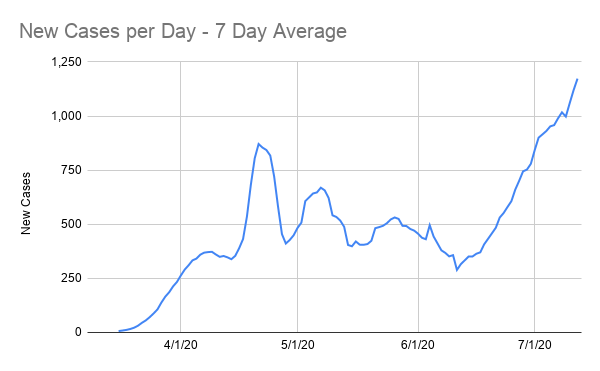 It takes about two weeks from the point of infection until people start showing symptoms. Memorial Day was May 25. Two weeks later was June 8. If you looked at this graph in late May and early June, when we were wrapping up the school year, you could reasonably conclude that we were on the right track. We might even be able to open schools in the fall. We’ll make some adjustments. We’ll put some social distancing measures in place, we’ll buy gallons of hand sanitizer, and we’ll get back to doing what we do best.