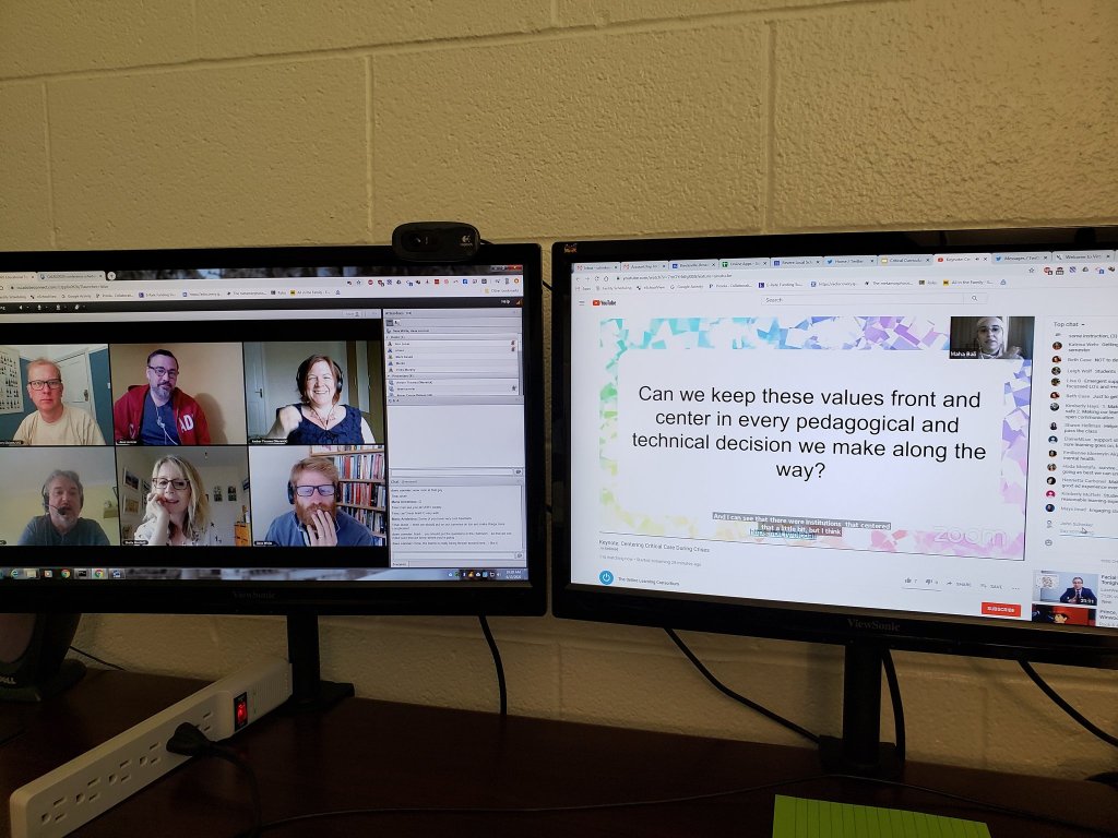 The idea of “being present” changes when the people involved are not all in the same place. I’ve certainly been in many situations in the last four months where I was doing multiple things simultaneously. There’s a video conference happening in this window over here, and I’m checking my email, or having a conversation with a colleague, or texting my family. There was one memorable experience this summer when I was in two different video conferences at the same time, and I was participating in both text chats simultaneously while selectively muting one or the other depending on what was happening. We don’t give 100% attention all the time when we’re online.