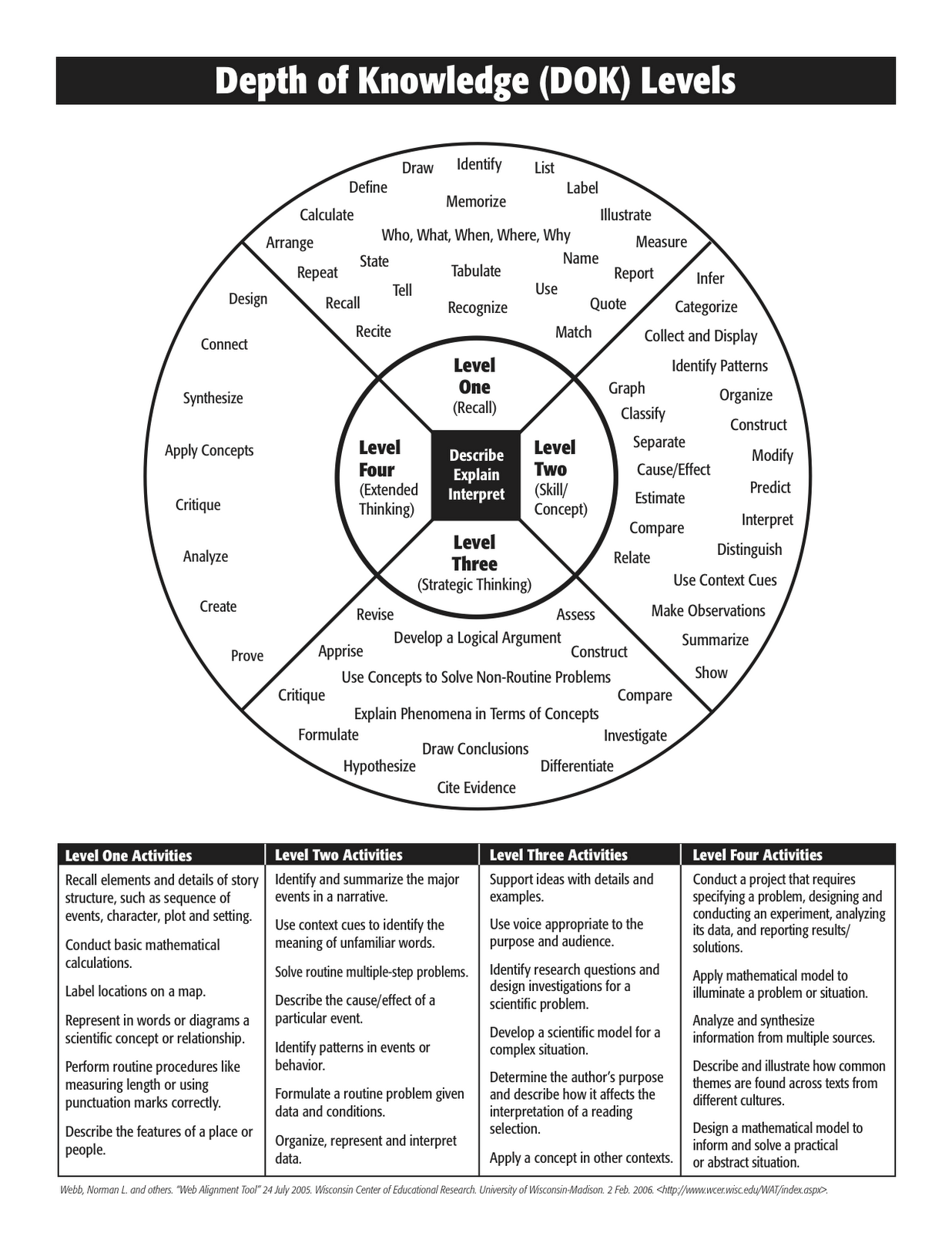 We’ve also embraced Webb’s Depth of Knowledge (DOK) as a structure to rate the cognitive demand required to complete a learning task. We generally over-simplify the model by dividing it into four levels and mapping verbs to each level. DOK level one focuses on information recall. Level two includes skills and concepts. Strategic thinking is the focus of level three. And at level four, extended thinking is evident. Different learning objectives require different levels of cognitive demand, but hopefully all students have opportunities to engage in learning activities that address levels three and four.