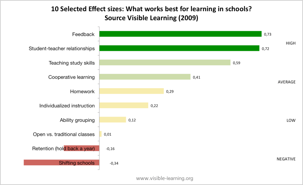 With 195 factors on the list, it’s impractical to include everything. You’ll often see ability grouping, class size, and homework on the list (all of which have a tiny positive effect compared to things like student agency and student-teacher relationships. This infographic does a really good job of illustrating 50 factors, including seven that we should focus on and seven that we shouldn’t be worrying about.